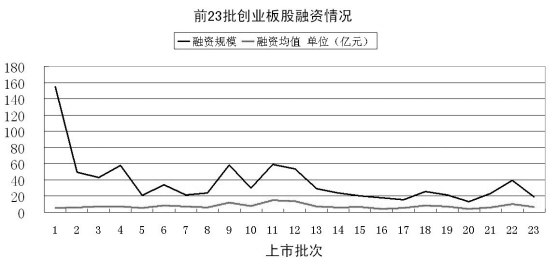 從融資規(guī)模看,前23批已上市的120只創(chuàng)業(yè)板股首發(fā)合計(jì)融資854.62億元,平均每股首發(fā)募資7.12億元。其中,首批28股合計(jì)融資154.78億元,居各批次之首;4月30日上市的第11批4股合計(jì)融資59.30億元緊隨其后;第9批、第4批及第12批創(chuàng)業(yè)板股首發(fā)融資額皆在50億元以上;而8月25日上市的第20批3股僅合計(jì)融資12.86億元,規(guī)模最小。