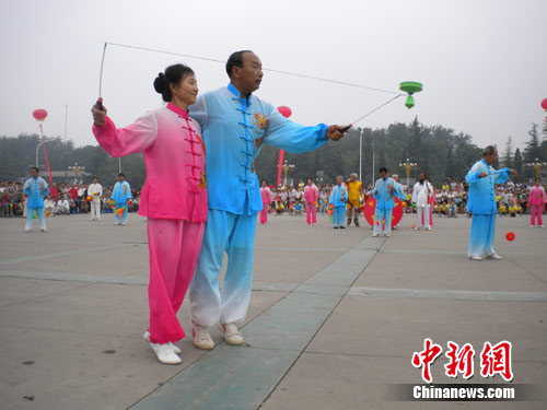 在保定人民廣場(chǎng)主會(huì)場(chǎng),近千名空竹愛好者在空竹大師吳春鳴的帶領(lǐng)下,通過“群英薈萃”、“龍飛鳳舞”、“竹韻聲聲”、“激情飛揚(yáng)”等表演,把空竹的盤、拋、接等技巧表現(xiàn)的淋漓盡致。場(chǎng)上巨型空竹、雙人空竹、輪滑空竹、頂竿空竹、呼啦圈空竹漫天飛舞,蔚為壯觀。