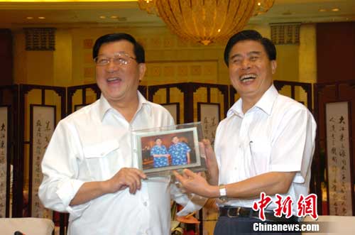 9月11日晚,廣東省省長(zhǎng)黃華華在廣州東方賓館會(huì)見(jiàn)了應(yīng)邀來(lái)訪的臺(tái)灣新竹縣縣長(zhǎng)、世界客屬總會(huì)會(huì)長(zhǎng)邱鏡淳等一行。圖為臺(tái)灣新竹縣長(zhǎng)、世界客屬總會(huì)會(huì)長(zhǎng)邱鏡淳向黃華華省長(zhǎng)贈(zèng)送于今年8月黃華華省長(zhǎng)訪臺(tái)時(shí)兩人的合照。