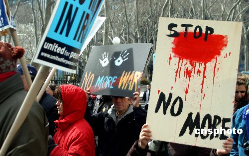 | 在美國發(fā)動伊拉克戰(zhàn)爭四周年之際,全美包括華盛頓、洛杉磯、紐約、舊金山、波特蘭等主要城市在當?shù)貢r間三月十八日爆發(fā)了大規(guī)模的反戰(zhàn)示威游行活動,抗議布什政府發(fā)動的伊拉克戰(zhàn)爭,呼吁美國軍隊盡快從伊拉克撤離。游行隊伍舉著“停止殺戮”、“現(xiàn)在就回家”等橫幅,高喊反戰(zhàn)口號,浩浩蕩蕩的行進各個城市的主要街道。圖為紐約市反戰(zhàn)游行現(xiàn)場。中新社發(fā) 鄧悅 攝