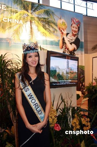 3月5日,2008柏林國(guó)際旅游展(ITB BERLIN)開幕,展覽為期5天將持續(xù)到9日。圖為第57屆世界小姐張梓琳作為“三亞形象大使”出現(xiàn)在展館。中新社發(fā) 關(guān)向東 攝