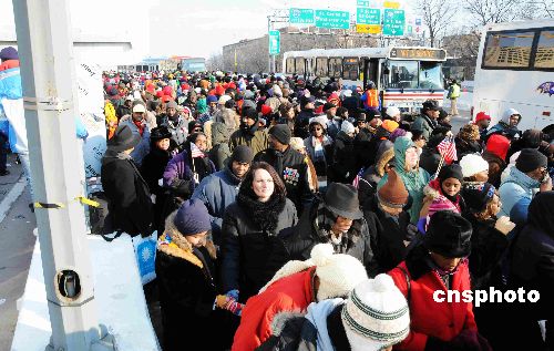 美國(guó)東部時(shí)間1月20日中午11點(diǎn)30分,美國(guó)第44任總統(tǒng)巴拉克·奧巴馬在國(guó)會(huì)山前宣誓就職。來自全美各地和世界各國(guó)的觀禮群眾200多萬人聚集華盛頓國(guó)家大草地觀看了這一盛大的就職典禮。由于官方禁止一切非官方車輛出入首都,百萬民眾在等待官方指定擺渡車時(shí),現(xiàn)場(chǎng)如同置身中國(guó)春運(yùn)。中新社發(fā) 邱江波 攝