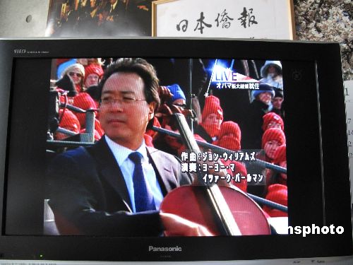 圖為日本電視臺實(shí)況轉(zhuǎn)播奧巴馬就職大典時(shí)馬友友演奏大提琴的鏡頭。美國華裔大提琴家馬友友,當(dāng)?shù)貢r(shí)間1月20日中午在奧巴馬的就職大典上,與其它三位音樂家合演了《空氣與簡樸禮物》(Air and Simple Gifts),獻(xiàn)給新總統(tǒng)。據(jù)報(bào)道,馬友友曾應(yīng)邀在五位美國總統(tǒng)面前獻(xiàn)藝,最早的一位是肯尼迪總統(tǒng),當(dāng)時(shí)的馬友友年僅七歲,與胞姐一起在白宮演出。馬友友16日接受哥倫比亞廣播公司訪問時(shí)興奮地說,“簡直不敢相信,這是四十五年前的事了”。但這可能比不上1月20日為奧巴馬在就職典禮上的表演,讓他感到更光榮與驕傲。中新社發(fā) 段躍中 攝