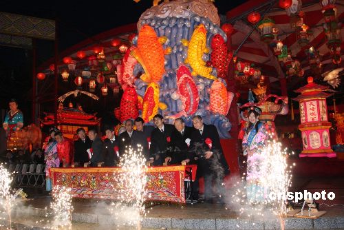 長崎市中心1月26日在主要街道掛起了15000盞中國傳統(tǒng)的提燈和各式彩燈。數(shù)以萬計的長崎市民和在長崎華僑華人一起走上街頭、徜徉燈海,同慶中國春節(jié)。圖為此次燈會的主會場長崎市湊公園于當(dāng)晚6時舉辦了盛大的點燈儀式。中國駐長崎總領(lǐng)館總領(lǐng)事滕安軍、當(dāng)?shù)厝A僑華人代表劉濟(jì)昌與長崎縣副知事立石曉、長崎市市長田上富久等人一起啟動點燈按鈕。 中新社發(fā) 關(guān)妍 攝