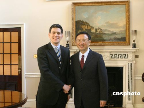 當(dāng)?shù)貢r(shí)間二月一日下午,陪同溫家寶總理訪英的中國外長楊潔篪在倫敦會晤英國外交大臣米利班德。中新社發(fā) 張朔 攝