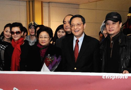 國務(wù)院僑辦主任李海峰率領(lǐng)的“文化中國·四海同春”藝術(shù)團今天(2月3日)下午抵達華盛頓,著名歌唱家宋祖英、閻維文等藝術(shù)家同機抵達,受到當?shù)厝A僑華人的熱烈歡迎。圖為中國駐美大使周文重率中國駐美大使館官員到機場迎接李海峰及明星們。中新社發(fā) 邱江波 攝