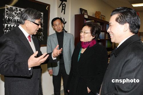 2月4日,國務(wù)院僑辦主任李海峰(右二)參觀了位于美國馬里蘭大學(xué)的孔子學(xué)院,并向孔子學(xué)院院長劉全生教授仔細(xì)詢問辦學(xué)狀況。中新社發(fā) 魏晞 攝