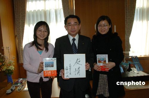 2月6日中午,日本文部科學(xué)大臣鹽谷立在東京大臣辦公室親切接見(jiàn)了第四屆中國(guó)人日語(yǔ)征文大賽主辦單位日本僑報(bào)社代表和兩名最優(yōu)秀獎(jiǎng)獲獎(jiǎng)?wù)摺本┐髮W(xué)日語(yǔ)系研究生徐蓓和湘潭大學(xué)青年教師張桐赫。鹽谷立大臣高度評(píng)價(jià)中國(guó)人日語(yǔ)征文大賽,為促進(jìn)日中兩國(guó)人民的相互理解起了積極的作用,勉勵(lì)獲獎(jiǎng)?wù)呃^續(xù)努力,為日中交流作出更大貢獻(xiàn)。鹽谷立為中國(guó)青少年題寫(xiě)了“友情”二字,期待日中兩國(guó)青少年世代友好。圖為鹽谷立接受徐蓓和張桐赫贈(zèng)送獲獎(jiǎng)作品集《我認(rèn)識(shí)的日本人》。中新社發(fā) 段躍中 攝