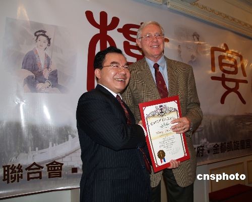 當(dāng)?shù)貢r(shí)間2月19日,“揚(yáng)州紅樓飲食文化節(jié)”在美國洛杉磯金都凱旋皇宮大酒店開幕,這是華夏“紅樓宴”首次登陸北美。洛杉磯縣政委員會(huì)主席安東諾維奇頒賀狀歡迎揚(yáng)州市副市長王玉新率揚(yáng)州紅樓飲食文化代表團(tuán)訪美。中新社發(fā) 盧威 攝