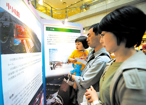 相比往年,本次“上海與上海世博會(huì)”圖片展首次利用了羽田機(jī)場(chǎng)這一重要交通窗口作為展示平臺(tái)。羽田機(jī)場(chǎng)1號(hào)出發(fā)大樓2樓大廳內(nèi),100多幅精心挑選的照片巨大而醒目,多媒體的宣傳片循環(huán)播放,讓機(jī)場(chǎng)成了一個(gè)“上海世博推介臺(tái)”。展區(qū)門口,“海寶”揮手迎客,可愛的模樣煞是惹人喜歡,孩子們紛紛上前拉拉“海寶”的手、親親“海寶”的臉。圖片展示成了機(jī)場(chǎng)內(nèi)的一個(gè)焦點(diǎn),眾多來往旅客紛紛駐足觀看,舉辦方則在不停地派發(fā)世博宣傳資料、贈(zèng)送世博小禮品,氣氛十分活躍。