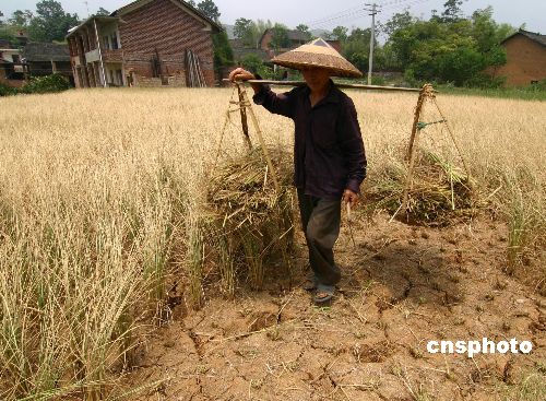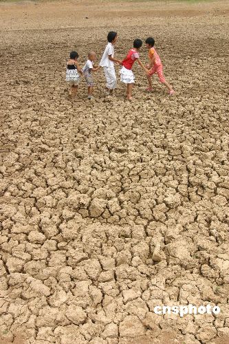 | 2007年8月5日消息,至7月底,婁底5個縣市區(qū)均出現(xiàn)了干旱,程度較深的為雙峰、漣源和新化。全市有84個鄉(xiāng)鎮(zhèn)受災(zāi),作物受旱面積73.28公頃,絕收25.665千公頃,其中水稻受旱面積65.12萬畝,絕收18.98萬畝;16.15萬口山平塘有6.3萬口完全干涸,部分地區(qū)人畜飲水發(fā)生困難,全市有16.45萬人、9.64萬頭大牲畜飲水困難。婁底市政府面對嚴(yán)重災(zāi)情高度重視,實行市級領(lǐng)導(dǎo)包縣市,縣市級干部包鄉(xiāng)鎮(zhèn),鄉(xiāng)鎮(zhèn)干部包村組,層層分工負(fù)責(zé)。受災(zāi)最嚴(yán)重的雙峰縣甘棠鎮(zhèn)山斗責(zé)任區(qū)的鹽井村投入10多萬元建起的4個蓄水池都已干涸,過幾天當(dāng)?shù)刂荒苡孟儡囘\水解村民飲水之困。僅甘棠鎮(zhèn)直接經(jīng)濟(jì)損失達(dá)1000萬元。湖南省有關(guān)領(lǐng)導(dǎo)指示受災(zāi)村民要采取積極抗旱措施,把災(zāi)情降到最低限度。幫助重災(zāi)區(qū)婁底走出困境,戰(zhàn)勝旱魔。中新社發(fā) 郭國權(quán) 攝