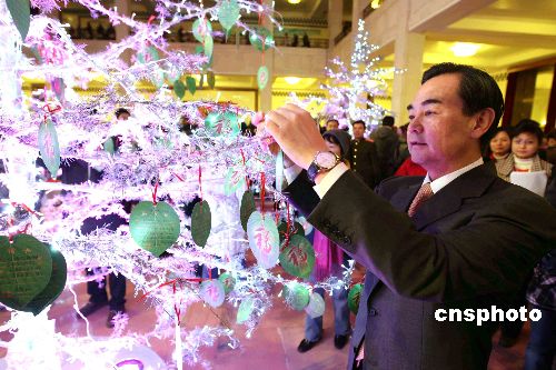 一月二十四日,中國外交部等在北京人民大會堂舉辦慰問駐外外交人員暨親屬春節(jié)聯(lián)歡會,為他們帶去節(jié)日最真誠的祝福。圖為外交部副部長王毅將祝?☉覓煸谧8渖稀V行律绨l(fā) 任海霞 攝
