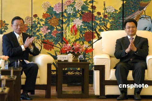 一月九日中午,廣州花園酒店,廣東省副省長(zhǎng)萬(wàn)慶良會(huì)見(jiàn)臺(tái)灣;鶗(huì)董事長(zhǎng)江丙坤及海協(xié)會(huì)與;鶗(huì)聯(lián)合參訪團(tuán)一行。中新社發(fā) 柯小軍 攝