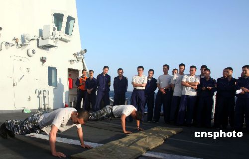 當(dāng)?shù)貢r(shí)間1月11日下午,正在亞丁灣海域執(zhí)行護(hù)航任務(wù)的“?凇碧枌(dǎo)彈驅(qū)逐艦舉行甲板運(yùn)動(dòng)會最后兩個(gè)項(xiàng)目賽事,圖為參賽官兵參加俯臥撐項(xiàng)目比賽。中新社發(fā) 孫自法 攝
