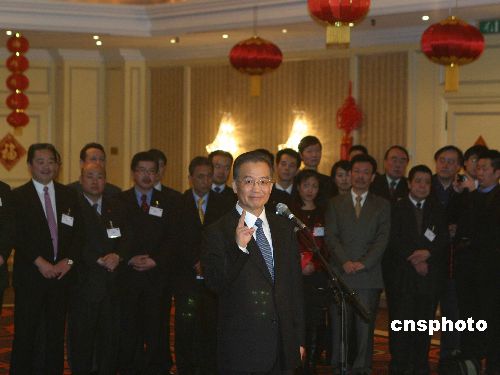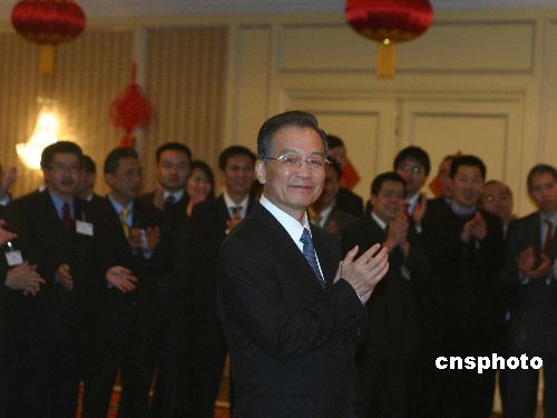 當?shù)貢r間一月二十九日晚,中國總理溫家寶在結(jié)束對德國的訪問后飛抵布魯塞爾,并首先看望了中國駐歐盟的外交官們和當?shù)厝A僑華人代表。會見現(xiàn)場被布置得充滿節(jié)日的喜慶氣氛。溫家寶笑言這次出訪被稱為“急行軍”,自己的時差也有點沒倒好。中新社發(fā) 張朔 攝