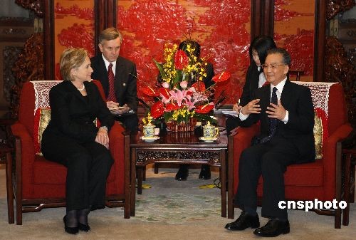 2月21日下午,中國國務(wù)院總理溫家寶在北京中南海紫光閣會(huì)見美國新任國務(wù)卿希拉里·克林頓。溫家寶在會(huì)見中引用《孫子兵法》中“同舟共濟(jì)”的成語,比喻中美兩國關(guān)系。中新社發(fā) 任晨鳴 攝
