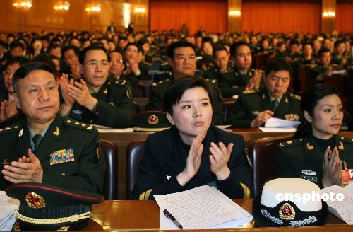 3月5日上午,十一屆全國(guó)人大二次會(huì)議在北京人民大會(huì)堂開幕,全國(guó)人大解放軍代表團(tuán)的代表認(rèn)真聽取國(guó)務(wù)院總理溫家寶所作《政府工作報(bào)告》。中新社發(fā) 任晨鳴 攝