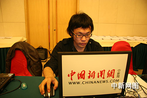 3月6日下午,出席十一屆全國人大二次會(huì)議的5位企業(yè)家代表在大會(huì)新聞中心(梅地亞中心多功能廳)就“企業(yè)如何應(yīng)對(duì)國際金融危機(jī)的挑戰(zhàn)”接受中外記者的采訪。圖為本網(wǎng)記者在現(xiàn)場(chǎng)進(jìn)行直播。中新網(wǎng)記者 唐偉杰 攝