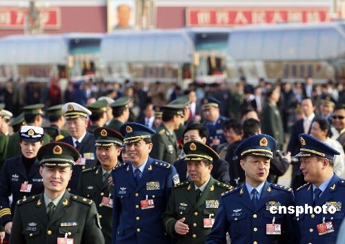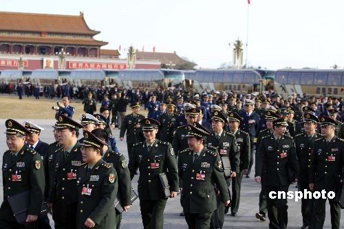 3月9日,十一屆全國人大二次會議在北京人民大會堂舉行第二次全體會議,解放軍代表團步入會場。中新社發(fā) 盛佳鵬 攝