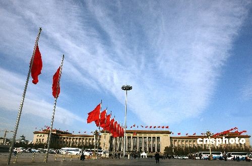 3月9日上午,北京人民大會堂上空襯托著藍天祥云。當日,十一屆全國人大二次會議第二次全體會議在北京人民大會堂舉行。中新社發(fā) 任晨鳴 攝