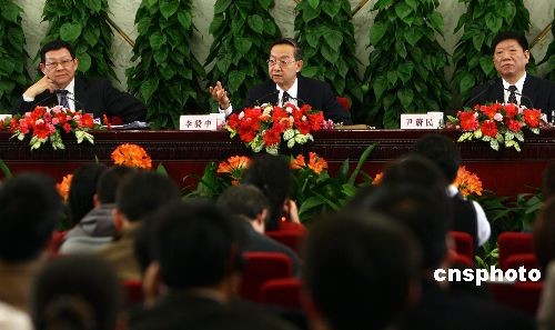3月10日,十一屆全國人大二次會議在人民大會堂舉行記者會,工業(yè)和信息化部部長李毅中(中)、人力資源和社會保障部部長尹蔚民(右)、商務(wù)部部長陳德銘(左)就“擴內(nèi)需、促就業(yè)、保增長”答記者問。中新社發(fā) 杜洋 攝