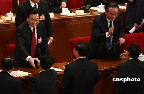 3月10日,中國(guó)國(guó)家主席胡錦濤、全國(guó)人大常委會(huì)委員長(zhǎng)吳邦國(guó)在第十一屆全國(guó)人民代表大會(huì)第二次會(huì)議第三次全體會(huì)議結(jié)束后和代表握手。中新社發(fā) 杜洋 攝