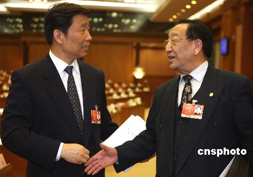 3月12日上午,十一屆全國人大二次會議第三次主席團會議在北京人民大會堂舉行。會議經(jīng)過表決,決定將關(guān)于全國人大常委會工作報告的決議草案、關(guān)于最高人民法院工作報告的決議草案、關(guān)于最高人民檢察院工作報告的決議草案提請各代表團審議。主席團成員李源潮(左)、列確(西藏自治區(qū)人大常委會主任)出席。中新社發(fā) 任晨鳴 攝