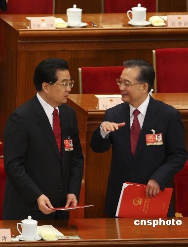 3月13日,第十一屆全國(guó)人民代表大會(huì)第二次會(huì)議在北京人民大會(huì)堂舉行閉幕會(huì),國(guó)家主席胡錦濤在會(huì)議閉幕后與國(guó)務(wù)院總理溫家寶交談。中新社發(fā) 盛佳鵬 攝