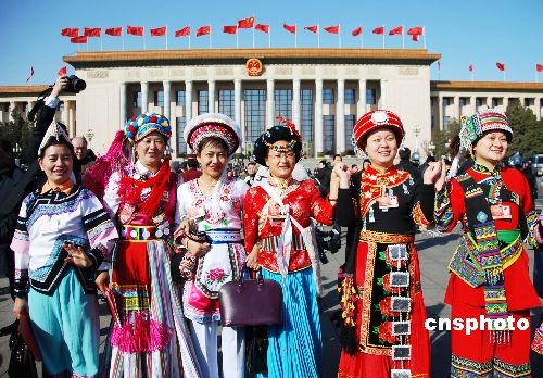 3月13日,一群少數(shù)民族全國人大代表參加“兩會”閉幕會后揮手告別,相約明年“兩會”再見。中新社發(fā) 韓海冰 攝