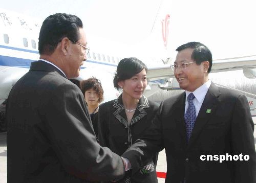 應(yīng)國(guó)務(wù)院總理溫家寶的邀請(qǐng)對(duì)中國(guó)進(jìn)行正式友好訪問的朝鮮內(nèi)閣總理金英日,三月十七日中午由北京乘機(jī)抵達(dá)濟(jì)南。圖為山東省副省長(zhǎng)才利民(右)在濟(jì)南國(guó)際機(jī)場(chǎng)迎接金英日總理。中新社發(fā) 張璐 攝