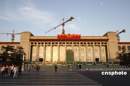 4月6日,中國國家博物館西門前罩上了綠色圍擋,工作人員正在加緊搭建上海世博會倒計時牌。據(jù)悉,該倒計時牌將于2009年5月1日上海世博會倒計時一周年之際正式亮相。全國政協(xié)常委、上海世博會執(zhí)委會執(zhí)行主任萬季飛在“兩會”期間表示,上海世博會將于明年5月1日開幕,在倒計時一周年之際,組委會將于今年5月1日在天安門廣場和國家博物館西門前豎立上海世博會倒計時牌,7月5日到15日將在首都博物館舉辦走進(jìn)世博會大型巡展。中新社發(fā) 鄭雄增 攝