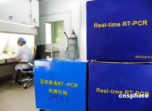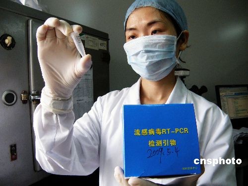 2009年5月5日,湖北省宜昌市疾病預(yù)防控制中心國家級(jí)流感網(wǎng)絡(luò)實(shí)驗(yàn)室內(nèi),工作人員在展示和預(yù)實(shí)驗(yàn)甲型H1N1流感病毒快速診斷試劑。甲型H1N1流感病毒快速診斷試劑由中國疾病預(yù)防控制中心和中國醫(yī)學(xué)科學(xué)院研制,可以在12小時(shí)內(nèi)檢測出樣本是否攜帶甲型H1N1流感病毒。據(jù)悉,甲型H1N1流感病毒快速診斷試劑已于2009年5月4日配發(fā)到中國84個(gè)流感網(wǎng)絡(luò)實(shí)驗(yàn)室。中新社發(fā) 劉君鳳 攝