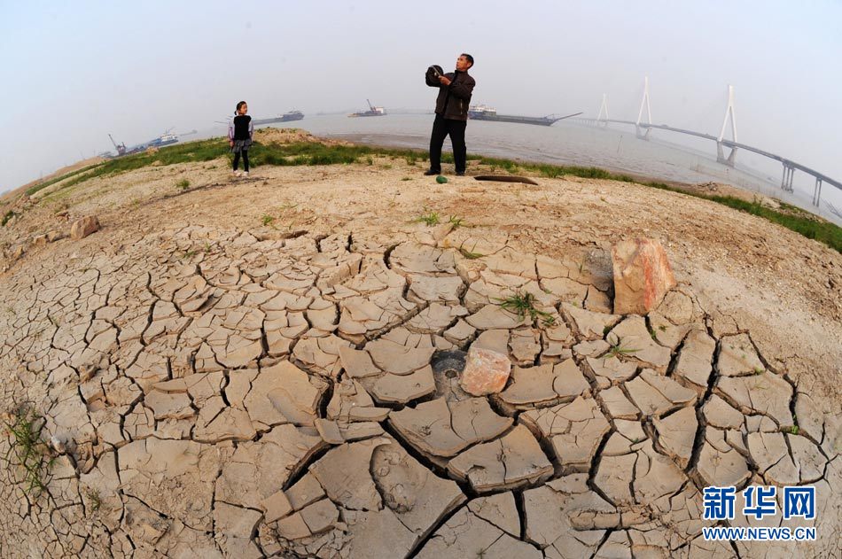 截至2010年11月14日17時(shí),長(zhǎng)江南京段水位降至4.08米,大片江岸河床裸露。近期,受中上游枯水和區(qū)域降雨量減少等因素影響,長(zhǎng)江南京段水位連續(xù)下降。圖為11月14日,長(zhǎng)江南京段南側(cè)江岸河床裸露,土層龜裂。圖片來源:CNSPHOTO 安東 攝