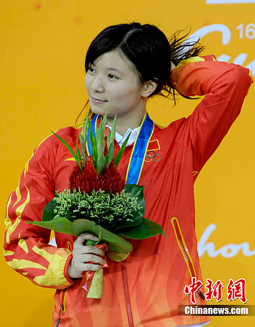 11月26日,在廣州亞運(yùn)會(huì)跳水女子3米跳板決賽中,中國選手何姿以總分382.00分的成績奪得金牌。中新社記者 王東明 攝