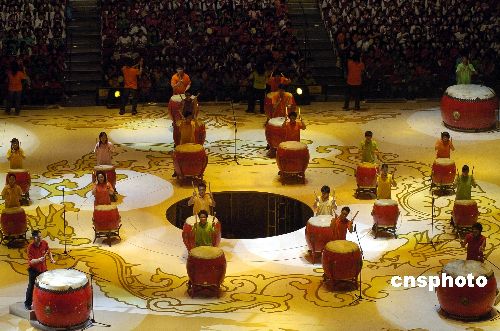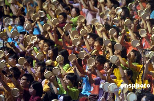 |   2007年6月29日,為慶祝香港回歸祖國10周年,萬名來自內(nèi)地、香港、澳門、臺灣的青年齊集香港體育館,以“鼓樂飛揚”的創(chuàng)意、勵志激昂的樂曲為藍本、擊打萬面鼓的形式,創(chuàng)出新的吉尼斯世界紀(jì)錄。本次活動主題為《龍聲鼓舞--萬人青年音樂會》,由香港民政事務(wù)局、中華全國青年聯(lián)合會、香港青年協(xié)會及中央電視臺等有關(guān)機構(gòu)聯(lián)合舉辦。萬人鼓樂《龍的傳人》和《紅日》曲目由著名打擊樂家龍向榮博士編曲及領(lǐng)奏,以五種鼓樂合奏,包括鈴鼓、布郎鼓、雙棍單皮鼓、沙槌鼓和皮手鼓,在超過一萬名青年齊心合奏下完成。中新社發(fā) 吳峻 攝