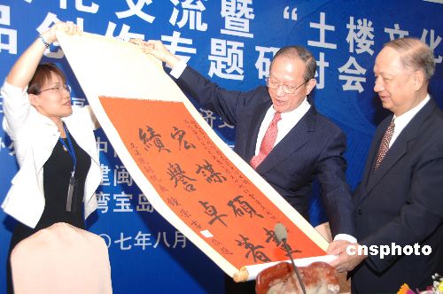 |   8月6日上午,歷時(shí)四天的“閩臺(tái)客家文化交流研討會(huì)”在福州開(kāi)幕。來(lái)自海峽兩岸的專家學(xué)者就以“土樓文化”為主題的文學(xué)、影視作品創(chuàng)作和傳播等進(jìn)行研討。研討會(huì)由福建省文化經(jīng)濟(jì)交流中心主辦,臺(tái)灣臺(tái)中市客家公共事務(wù)協(xié)會(huì)、福建閩西客家聯(lián)誼會(huì)、臺(tái)灣寶島客家廣播電臺(tái)協(xié)辦。圖為開(kāi)幕式上,臺(tái)灣客家專家學(xué)者代表團(tuán)名譽(yù)團(tuán)長(zhǎng)、臺(tái)灣親民黨榮譽(yù)副主席鐘榮吉(中)向福建省文化經(jīng)濟(jì)交流中心理事長(zhǎng)游德馨(右)贈(zèng)送書法作品。中新社發(fā) 鄭祚聲 攝
