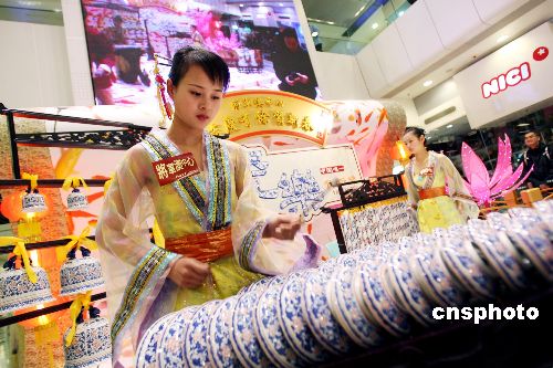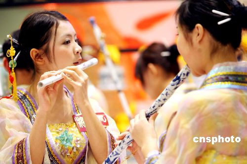 一月十五日,景德鎮(zhèn)青花女子瓷樂團(tuán)成員以仿唐宮廷服飾裝扮在香港將軍澳中心吹奏瓷簫、瓷笛。首次訪港的景德鎮(zhèn)青花女子瓷樂團(tuán)將于新春期間在香港多個大型商場巡回演出。中新社發(fā) 洪少葵 攝