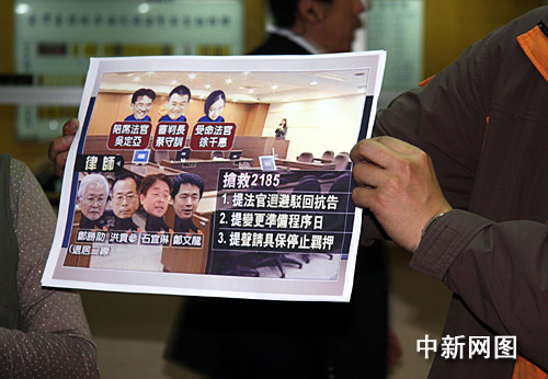 1月19日,臺北地方法院首次開庭審理前臺灣地區(qū)領導人陳水扁家弊案。傳訊陳水扁到地院準備程序庭。因庭審現(xiàn)場不能拍照、錄影。有臺媒出招展示今日合議庭法官與陳水扁委任律師攻放圖進行連線直播。中新社記者 陳立宇 攝