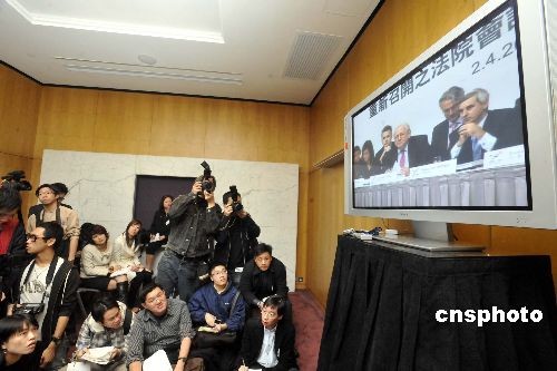 二月四日,電訊盈科在香港會(huì)議展覽中心舉行股東特別大會(huì)表決私有化議案。圖為媒體只能在會(huì)場(chǎng)外一個(gè)房間透過大會(huì)安排電視轉(zhuǎn)播關(guān)注場(chǎng)內(nèi)會(huì)議情況。中新社發(fā) 鄧慶樂 攝