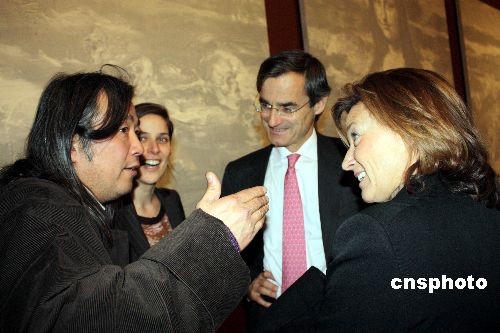 法籍華人畫家嚴培明個人畫展《蒙娜麗莎的葬禮》二月十一日晚在巴黎盧浮宮博物館德農(nóng)廳揭幕。圖為嚴培明(左)在畫展揭幕式上與法國藝術(shù)界人士交流。中新社發(fā) 吳衛(wèi)中 攝