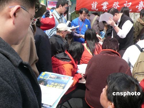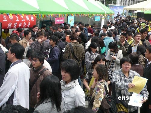大環(huán)境經(jīng)濟(jì)不景氣,臺(tái)灣去年十二月失業(yè)率超過(guò)百分之五,失業(yè)人口近五十無(wú)萬(wàn)!爸饔(jì)處”對(duì)今年經(jīng)濟(jì)成長(zhǎng)率的預(yù)測(cè)為負(fù)百分之二點(diǎn)九七。臺(tái)北市政府勞工局在二十一日舉行了一場(chǎng)就業(yè)博覽會(huì),釋出兩千多個(gè)工作職位,并提供職業(yè)訓(xùn)練課程供民眾申請(qǐng)。中新社發(fā) 路梅 攝