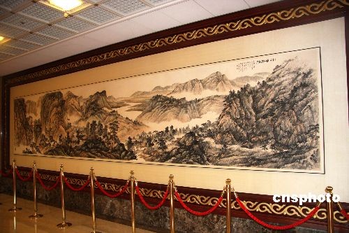 張大千、黃君壁、溥心悆有中國畫渡海來臺三大家之稱。圖為臺灣戲劇院中懸掛的黃君壁與人合作的大幅國畫作品“膴膴原川”。渡海來臺三大家雖均已故去,但許多作品卻在臺灣保留下來。中新社發(fā) 陳立宇 攝