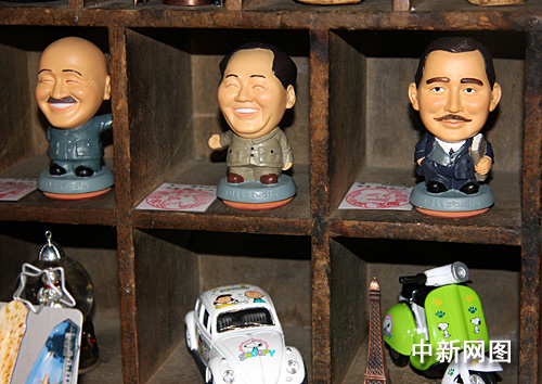 毛澤東、孫中山、蔣介石公仔如今不僅在中國國民黨黨史館中很受大陸游客的歡迎,在臺灣不少禮品店中也有出售,圖為臺北縣碧潭一家禮品店中的毛澤東、孫中山、蔣介石公仔。老板說,銷路不錯。陳立宇 攝