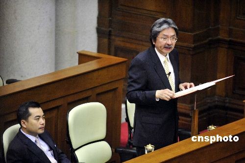 二月二十五日,香港特區(qū)財政司司長曾俊華在立法會大樓會議廳向立法會提交二零零九至二零一零年度財政預算案。中新社發(fā) 譚達明 攝