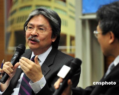 三月三日,香港特區(qū)財(cái)政司司長(zhǎng)曾俊華,在浸會(huì)大學(xué)與學(xué)生舉行座談會(huì),討論財(cái)政預(yù)算案。中新社發(fā) 譚達(dá)明 攝