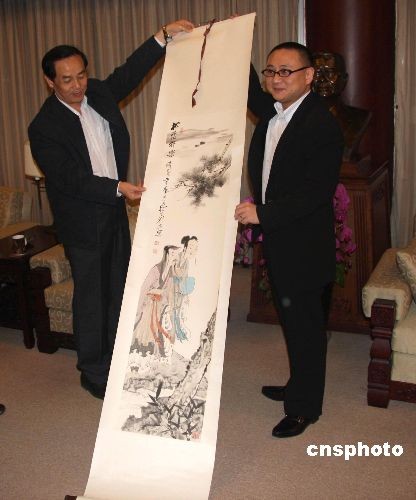 三月二十五日,由十七家大陸中央媒體負責人組成的訪問團拜訪臺灣《聯(lián)合報》。圖為訪問團團長、《人民日報》總編輯吳恒權(quán)(左)向《聯(lián)合報》贈送禮品。中新社發(fā) 耿軍 攝