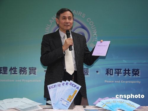 四月七日下午,臺(tái)灣“陸委會(huì)”召開臨時(shí)記者會(huì),推介《兩岸會(huì)談相關(guān)政策說明》、《ECFA兩岸經(jīng)濟(jì)合作架構(gòu)協(xié)議政策說明》兩種新印發(fā)的宣傳手冊(cè),為即將舉行的第三次“陳江會(huì)談”創(chuàng)造積極的輿論氛圍!瓣懳瘯(huì)”副主委劉德勛主持記者會(huì),對(duì)兩本宣傳手冊(cè)做介紹說明。中新社發(fā) 耿軍 攝