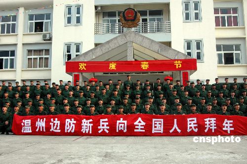 1月24日,駐守在東海之濱的浙江溫州邊防支隊全體新戰(zhàn)士在第二故鄉(xiāng)向全國人民拜年,祝祖國繁榮昌盛,祝人民新春快樂!中新社發(fā) 吳水斌 攝