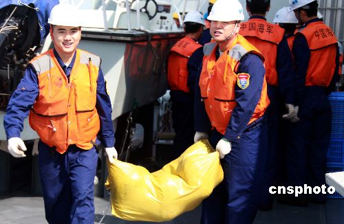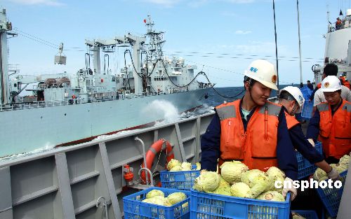 春節(jié)前夕,中國海軍艦艇編隊(duì)“?凇碧(hào)導(dǎo)彈驅(qū)逐艦與“微山湖”號(hào)綜合補(bǔ)給艦完成一次海上補(bǔ)給,圖為“?凇迸灩俦徇\(yùn)補(bǔ)給到艦上的“年貨”。中新社發(fā) 孫自法 攝
