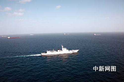 當(dāng)?shù)貢r(shí)間2月18日早晨,中國(guó)海軍艦艇編隊(duì)順利完成在亞丁灣、索馬里海域執(zhí)行護(hù)航任務(wù)以來(lái)最大規(guī)模的一次護(hù)航行動(dòng),將中外13艘商船送抵亞丁灣東部安全海域。圖為17日在艦載直升機(jī)上航拍“?凇碧(hào)導(dǎo)彈驅(qū)逐艦護(hù)航商船的場(chǎng)景。作者 倪容攝